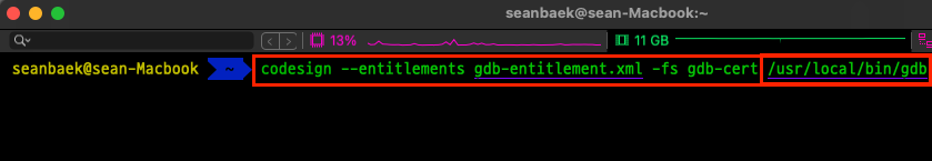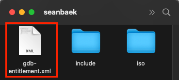 참고) 저는 저의 홈 디렉터리에 gdb-entitlement.xml 파일을 만들었습니다.