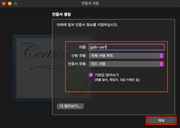 메뉴바 -> 키체인 접근 -> 인증서 지원 -> 인증서 생성...