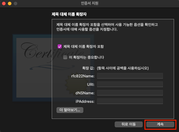 위에서 '인증서 생성...' 을 누르면 아래의 창이 뜰 것입니다.