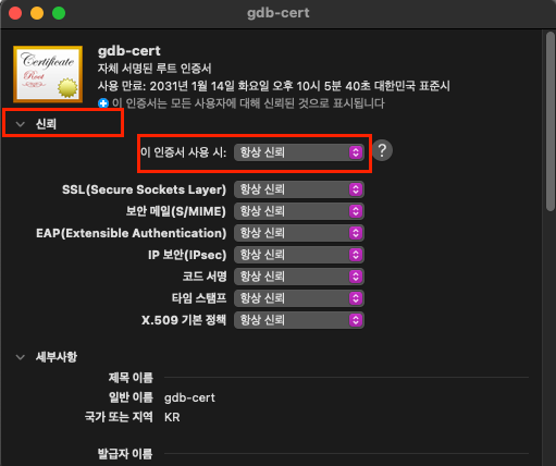 이 항목의 값을 '항상 신뢰'로 변경한 뒤 '정보 가져오기' 창을 끔으로써 해당 인증서를 항상 신뢰할 수 있도록 해줍니다.