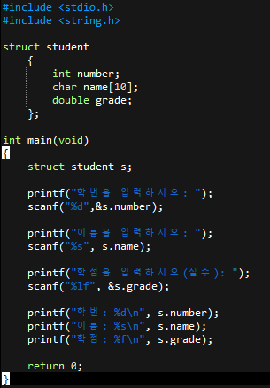 13번째 줄 : student라는 이름을 가진 구조체의 변수가 선언되었다.