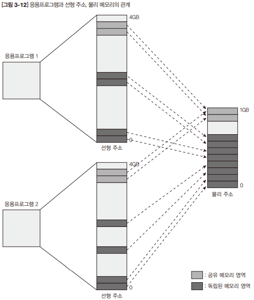반대로 페이징 자료구조를 따로따로 생성하여 물리 메모리에 중복되지 않게 연결해줌으로써 응용 프로그램마다 독립적인 주소 공간을 보장할 수도 있습니다.