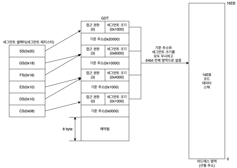세그먼트 디스크립터에 설정된 기준 주소와 크기에 관계없이 모든 세그먼트가 기준 주소는 0이고, 크기는 64bit 전체로 설정됩니다.