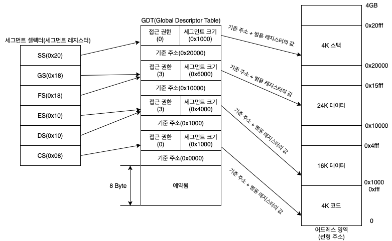 그리고 프로세서는 GDT의 위치를 빠르게 넘기기 위해 이를 내부에 저장해두었다가 세그먼트 셀렉터(세그먼트 레지스터)를 통해 주소에 접근할 때마다 GDT의 위치를 찾는데 이용합니다.
