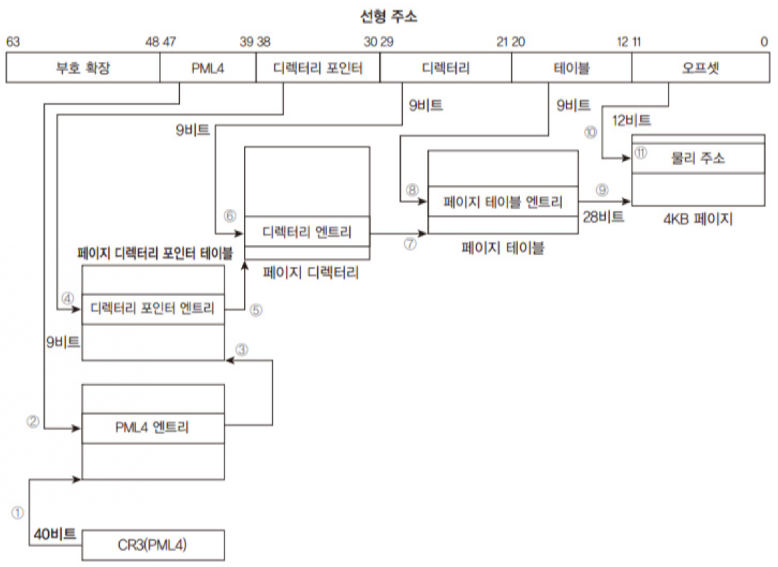 ② PML4의 시작 주소에 선형 주소의 PML4 오프셋을 이용하여 해당 PML4 엔트리를 찾습니다.