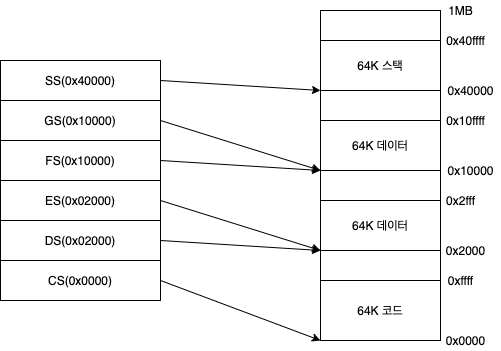 한 세그먼트의 크기는 64K로 고정이며, 세그먼트의 시작 주소는 세그먼트 레지스터에 직접 설정합니다.