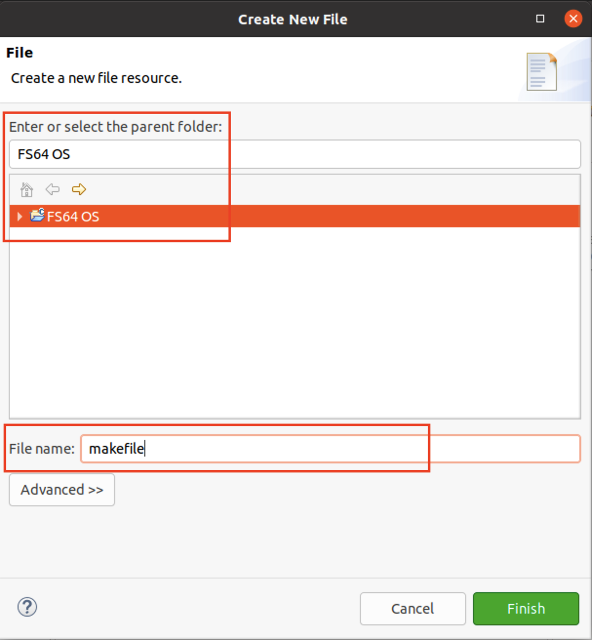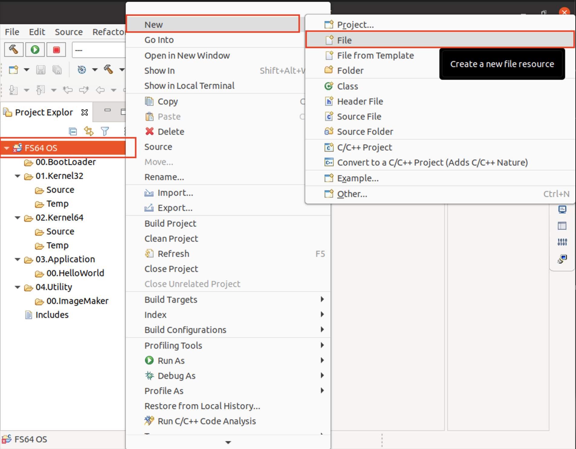 저의 기준으로 프로젝트 디렉터리 FS64 OS에서 우클릭 -> New -> File을 누릅니다.