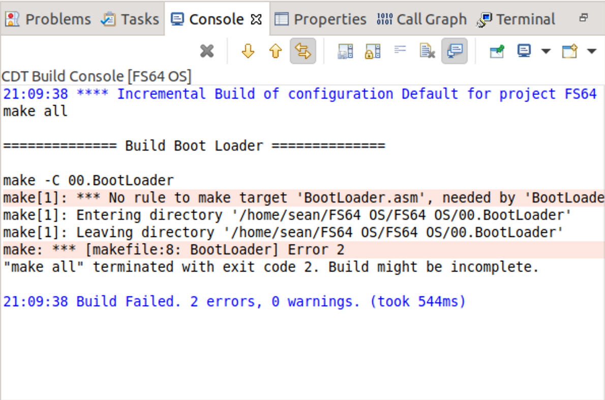 Ubuntu 내의 Terminal에서 해당 프로젝트 디렉터리(FS64 OS)로 이동하여 make를 입력했을 때 아래의 사진과 같이 오류가 뜨면 정상적으로 동작한 것입니다.
