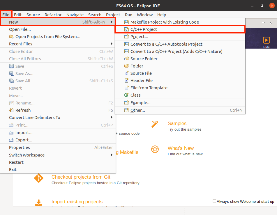 그리고 아래의 사진과 같이 위의 상단 메뉴에서 File -> New -> C/C++ Project를 눌러 프로젝트 생성 화면으로 들어가 줍니다.