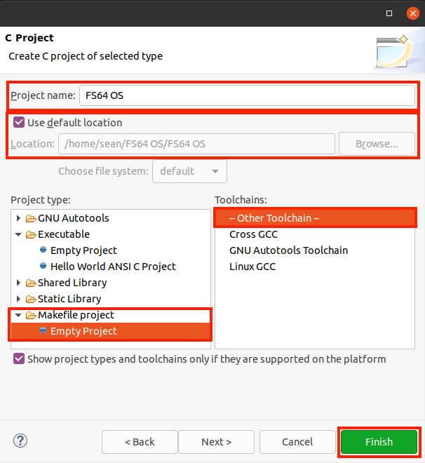 저는 Eclipse의 기본 디렉터리가 /home/sean/FS64 OS이고 해당 디렉터리 안에 FS64 OS라는 이름의 프로젝트 디렉터리를 생성했습니다.