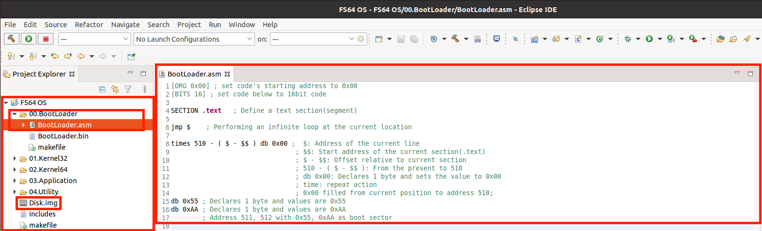 00.BootLoader 디렉터리에 BootLoader.asm 파일을 생성하고 아래의 사진의 내용을 입력하여 저장한 뒤 빌드(Ctrl + B)를 수행했을 때 정상적으로 빌드가 되었다면 자신의 프로젝트 최상위 디렉터리에 Disk.img 파일이 생성됩니다.