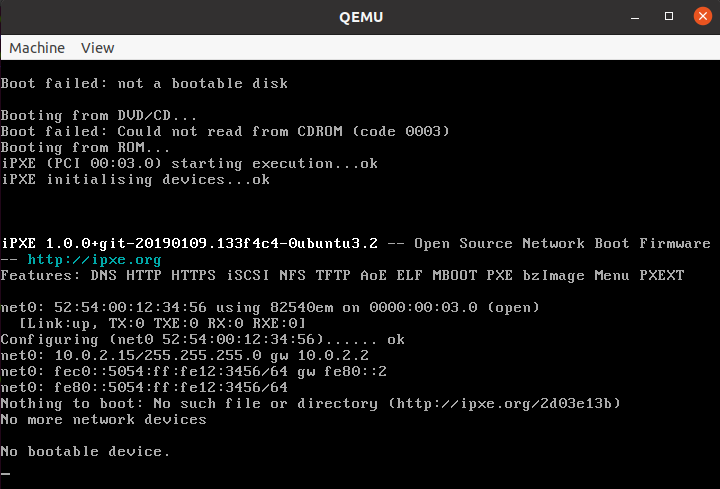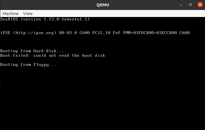부트 로더가 정상적으로 실행되지 않았을 때는 어떻게 될지 궁금하다면 부트 로더 코드 마지막에 있는 db 0x55와 db 0xAA를 db 0x00와(과) db 0x00으로 바꿔서 빌드한 뒤 qemu를 실행해보면 알 수 있습니다.(아래의 사진 참고)