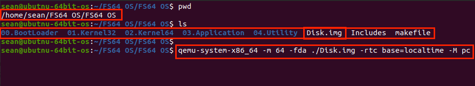 저는 /home/sean/FS64 OS/FS64 OS 디렉터리에 생성한 디렉터리들이 있고, 빌드를 했기 때문에 Disk.img 파일이 있습니다.