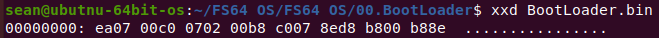이미지를 생성하는 프로그램을 작성하기 전에 부트 로더 이미지 파일(BootLoader.bin)에 있는 TOTALSECTORCOUNT의 오프셋을 확인하기 위해 우분투에서 xxd 또는 hexdump(윈도에서는 HxD) 명령어로 이 파일을 열면 첫 부분이 아래와 같이 표시됩니다.