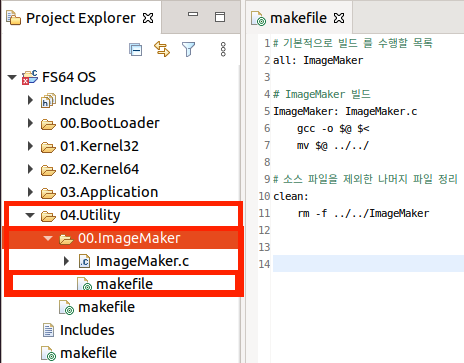ImageMaker.c를 빌드하면 ImageMaker 프로그램이 생기는데 makefile(04.Utility/00.ImageMaker/makefile)에서 mv 명령으로 ImageMaker 프로그램을 최상위 디렉터리(FS64 OS/)로 이동시켜주기 때문에 아래와 같이 최상위 디렉터리의 makefile을 수정합니다.