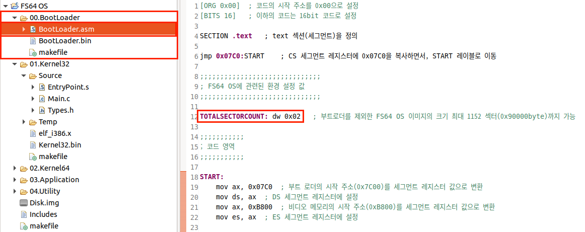 따라서 00.BootLoader 디렉터리에 있는 BootLoader.asm 파일의 TOTALSECTORCOUNT의 값을 2로 수정한 후 다시 빌드하면, 지금까지 잘 따라왔다면 오류 메시지 없이 Disk.img 파일이 생성될 것입니다.