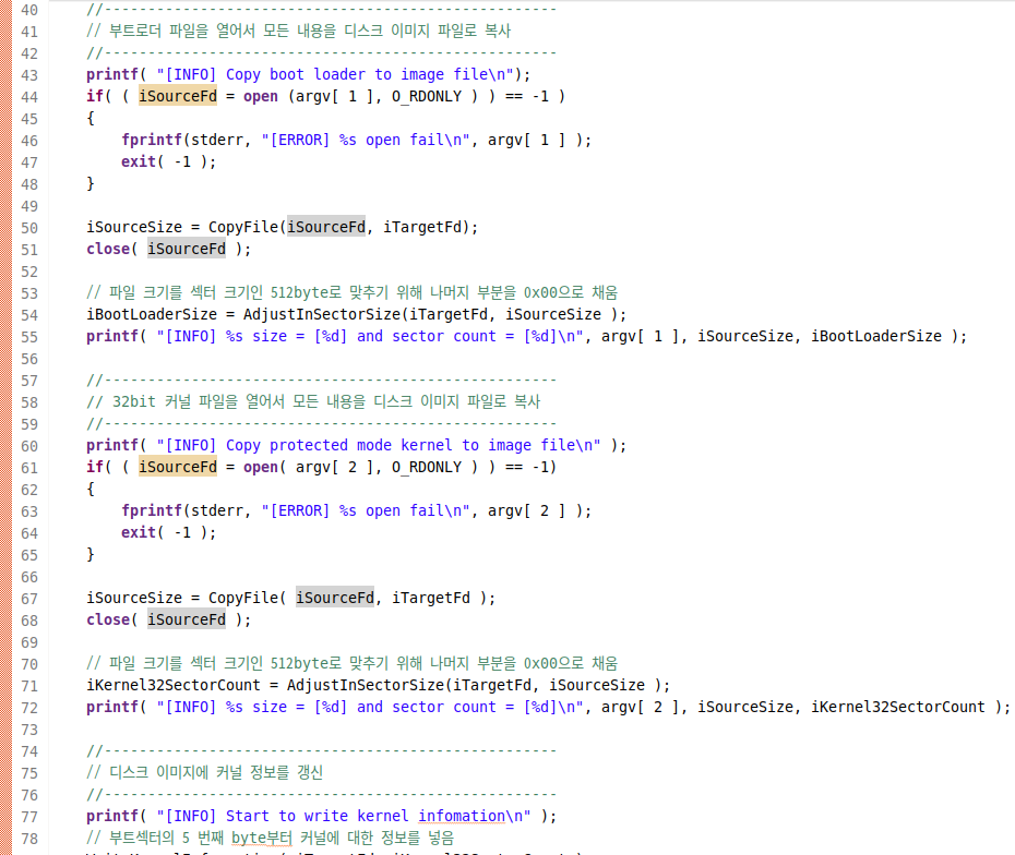 위의 작업을 수행해주는 간단한 프로그램을 제작하여 빌드 시에 cat 프로그램 대신 사용하고, 부가 기능으로 부트 로더에 TOTALSECTORCOUNT까지 자동으로 변경하는 기능도 추가하여 빌드할 때마다 값을 수정해야 했던 불편함도 없애겠습니다.