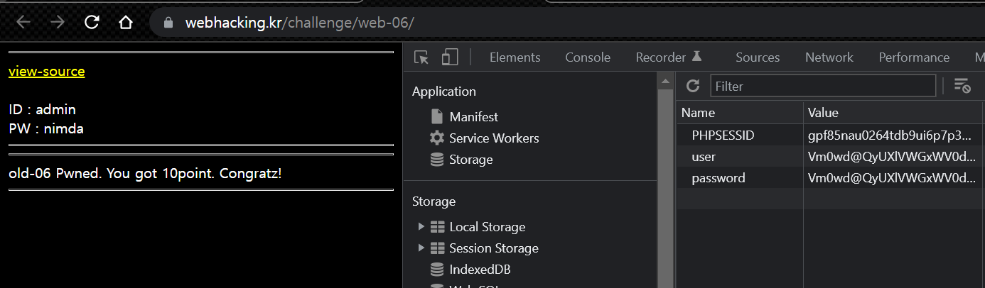 위의 스크립트를 실행하면 admin과 nimda에 대한 base64 인코딩 값이 나오고 문제 페이지에서 F12 개발자 도구를 이용해 user와 password 쿠키 값을 설정한 뒤 새로고침 하면 풀린다.