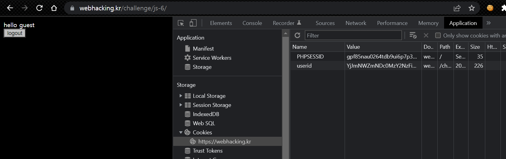 guest의 첫 글자 'g' 단일 문자를 넣고 userid 쿠키를 확인하면 위의 값이 들어있다.
