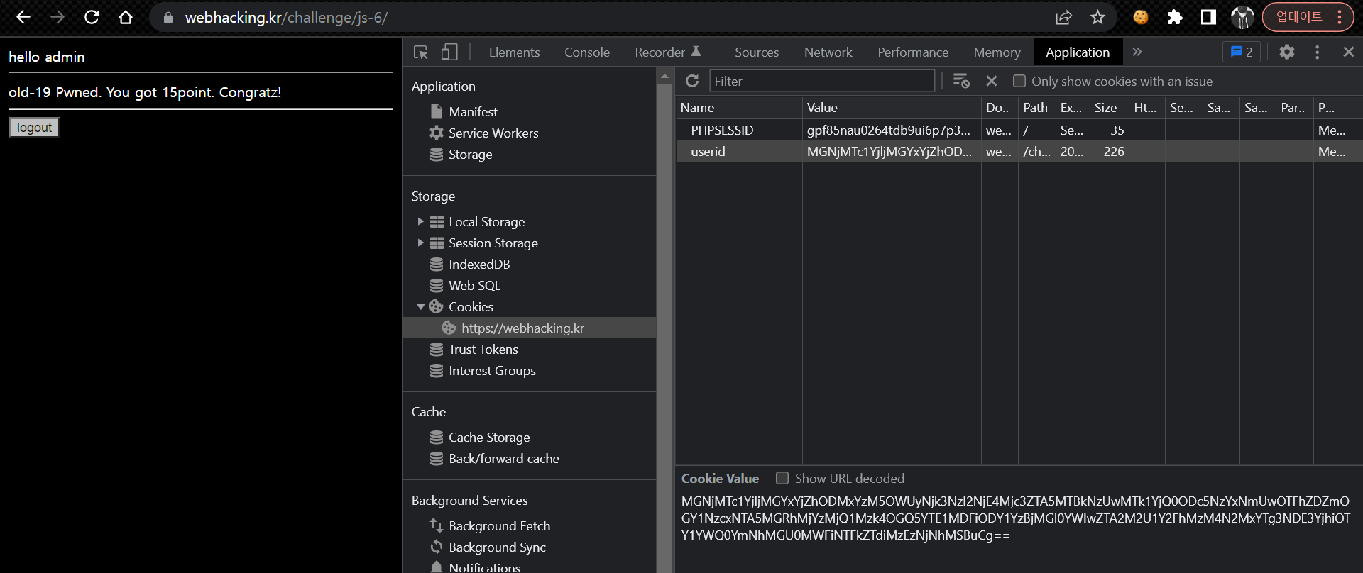 위의 MD5 문자열들을 모두 합쳐 base64 인코딩 한 뒤 userid 쿠키에 값으로 설정한 뒤 새로고침 하면 문제가 풀린다.
