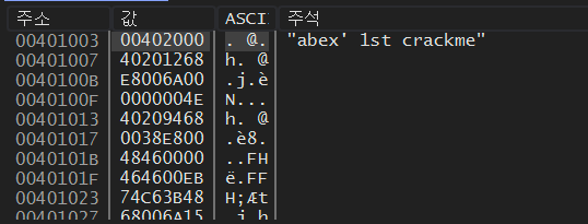 dump 창에서 401003의 값을 보면 402000주소를 가리키고 있고, 이 주소에는 “abex’ 1st crackme” 문자열이 담겨있다.