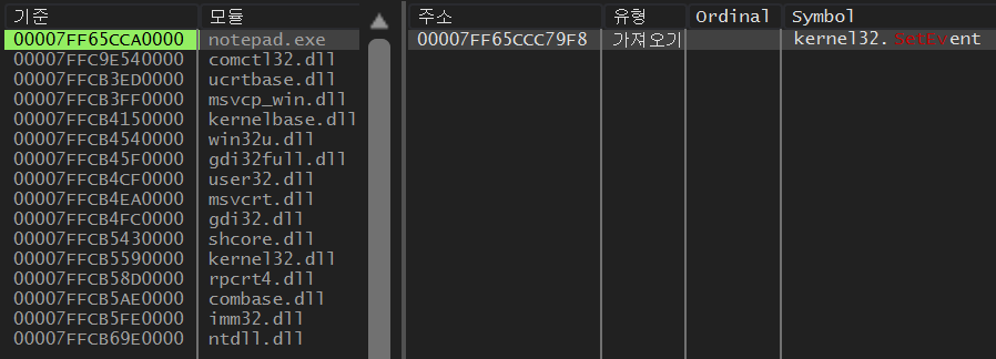 위의 위치로 이동하면 이전에 확인했던 kernel32.dll!SetEvent 함수가 있다.