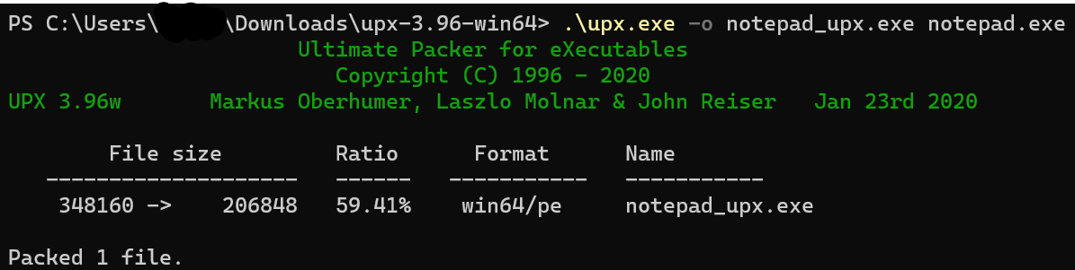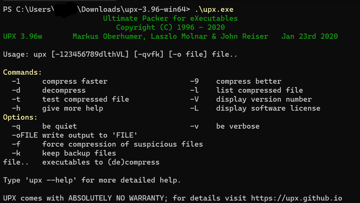 명령 프롬프트 혹은 PowerShell에서 UPX 디렉토리로 이동한 후 위의 사진과 같이 입력했을 때 출력 화면이 같으면 끝이다.