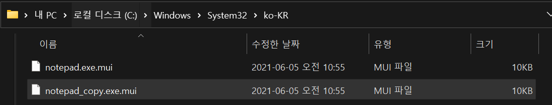 (ko-KR 폴더는 notepad.exe 파일과 동일한 경로 안에 존재하면 되고, ko-KR 폴더 안에는 notepad.exe와 동일한 이름을 가진 .mui 파일이 있어야 한다.)