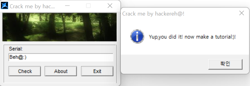 위에서는 Reh@:) 라는 serial 값이 나왔지만 Beh@:)을 입력해도 성공 메세지가 보인다.
