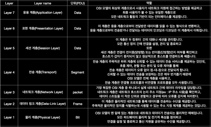 이번 글에서는 OSI 7계층의 각 계층들이 무슨 무슨 역할들을 하고,