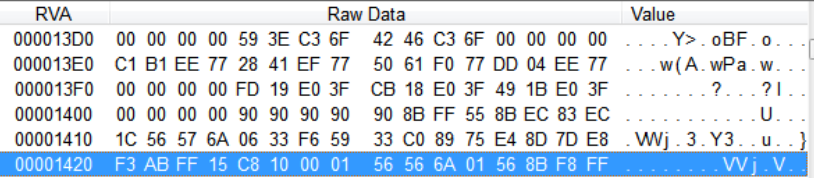 RVA 1424 주소에는 프로그램의 하드코딩된 주소 10010C8 값이 들어있다.