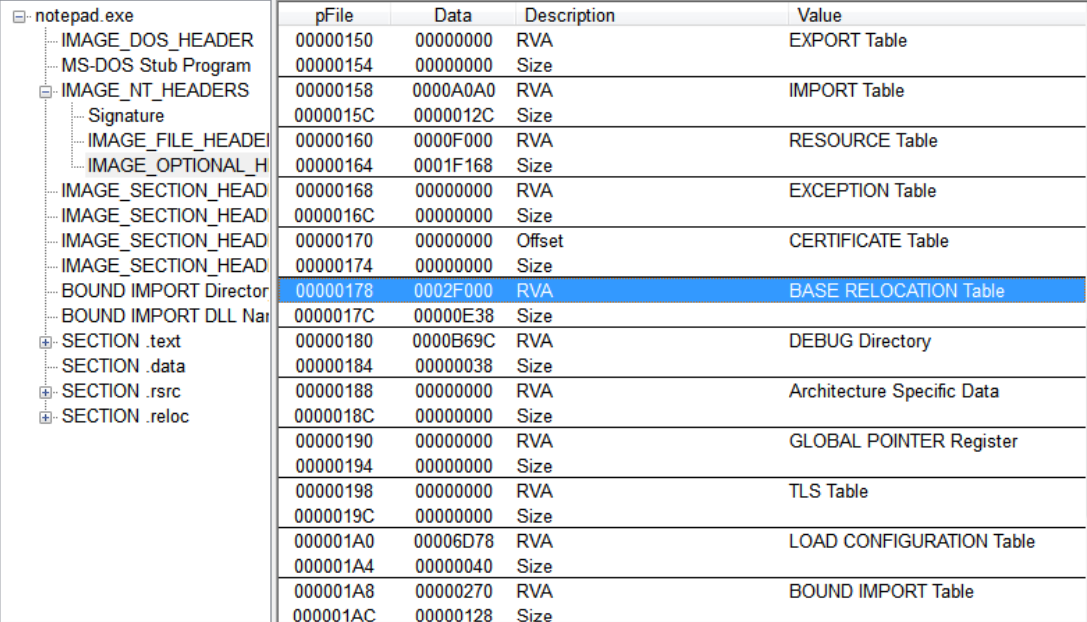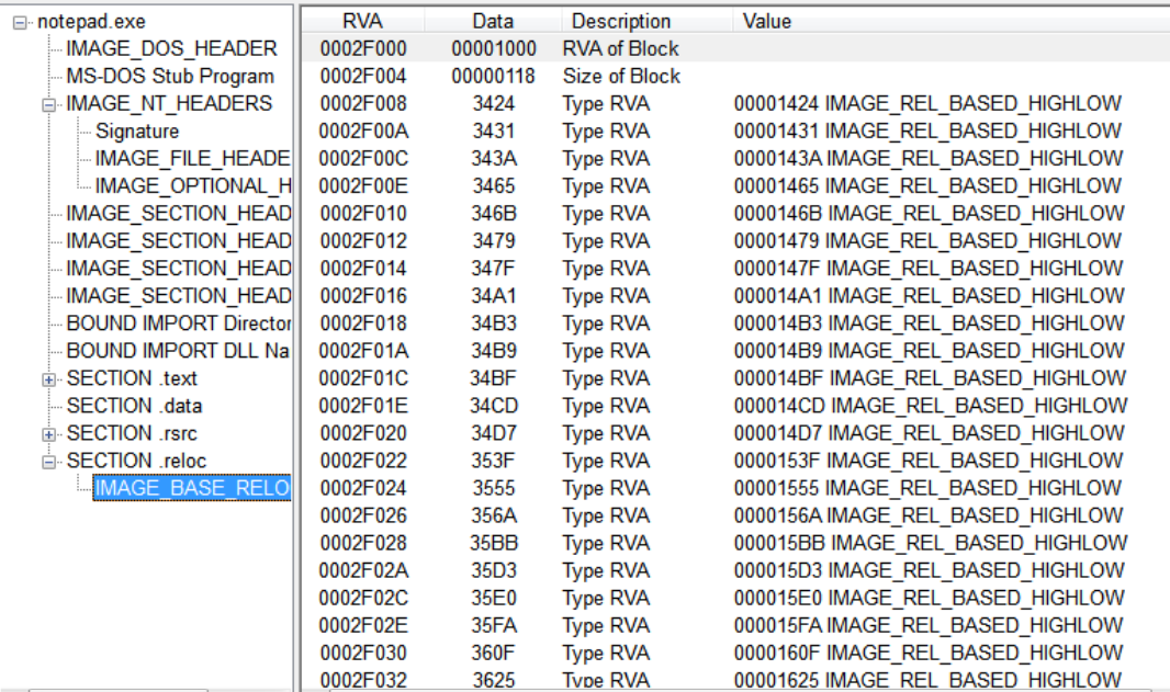 PEView에서 notepad.exe의 Base Relocation Table 주소를 확인해보면 위와 같다.
