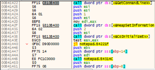 x32dbg에서 notepad.exe를 재실행할 때마다 위에서 봤던 주소 값들은 로딩 주소에 맞게 매번 변경된다.
