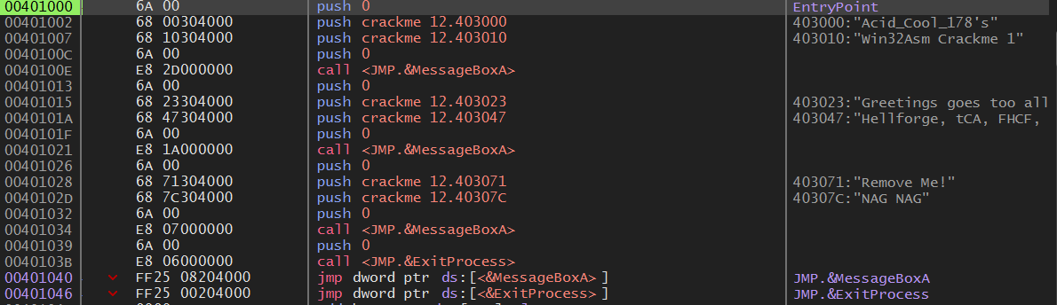 401034 주소의 명령을 보면 MessageBoxA 함수를 호출하는 401040 주소를가 써져있다.