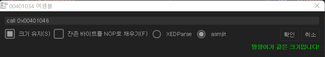 그렇다면 이 부분에 적힌 주소를 401046으로 바꾸어 ExitProcess를 호출하도록 하면 된다.