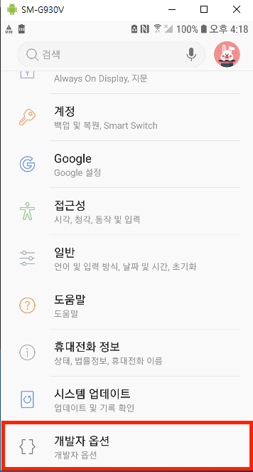 만약 못 봤다면 "설정" 처음 화면에서 개발자 옵션 항목이 생겼는지 확인해보면 되고
