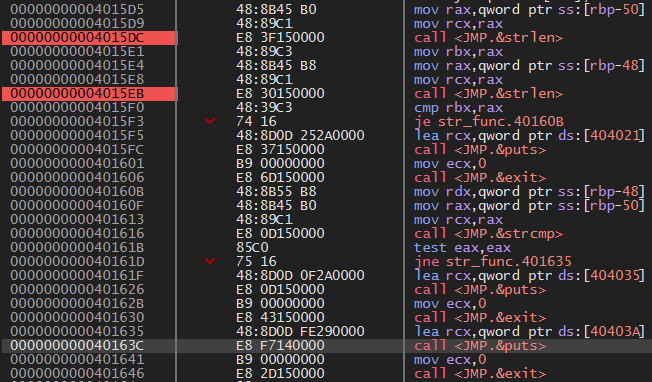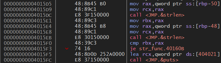 4015F3 주소에서 입력된 패스워드 문자열의 길이와 비교할 문자의 길이를 비교해서 같을 경우 40160B로 점프하여 입력한 문자와 비교할 문자가 같은지 비교하고, 같지 않을 경우 4015F5 주소로 가서 length Not Match!!! 메시지를 출력한다.