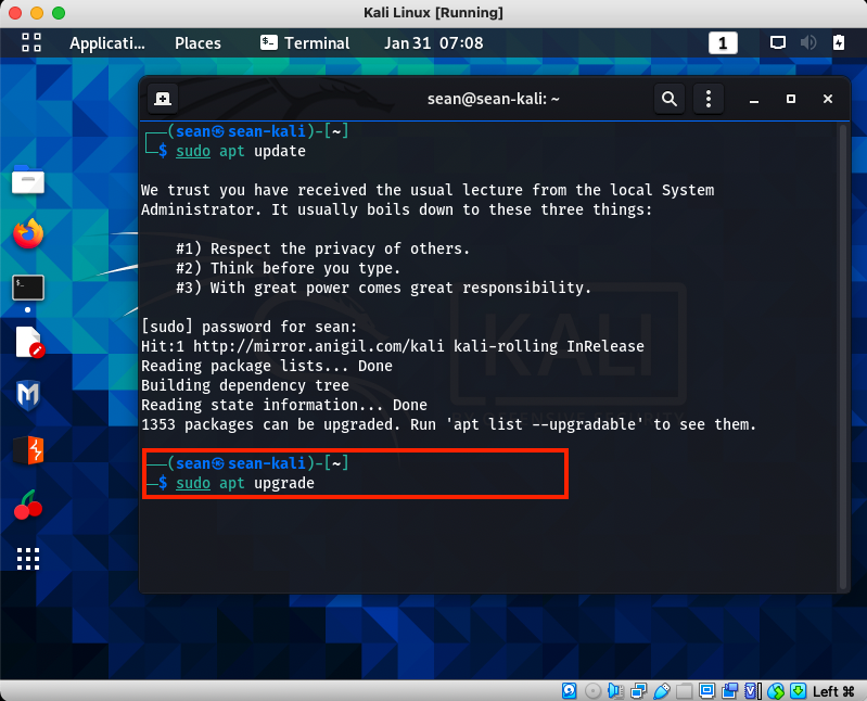 이제 Kali Linux 설치가 완료되었으니 내장되어 있는 프로그램들을 최신 버전으로 업데이트해주어야 합니다.