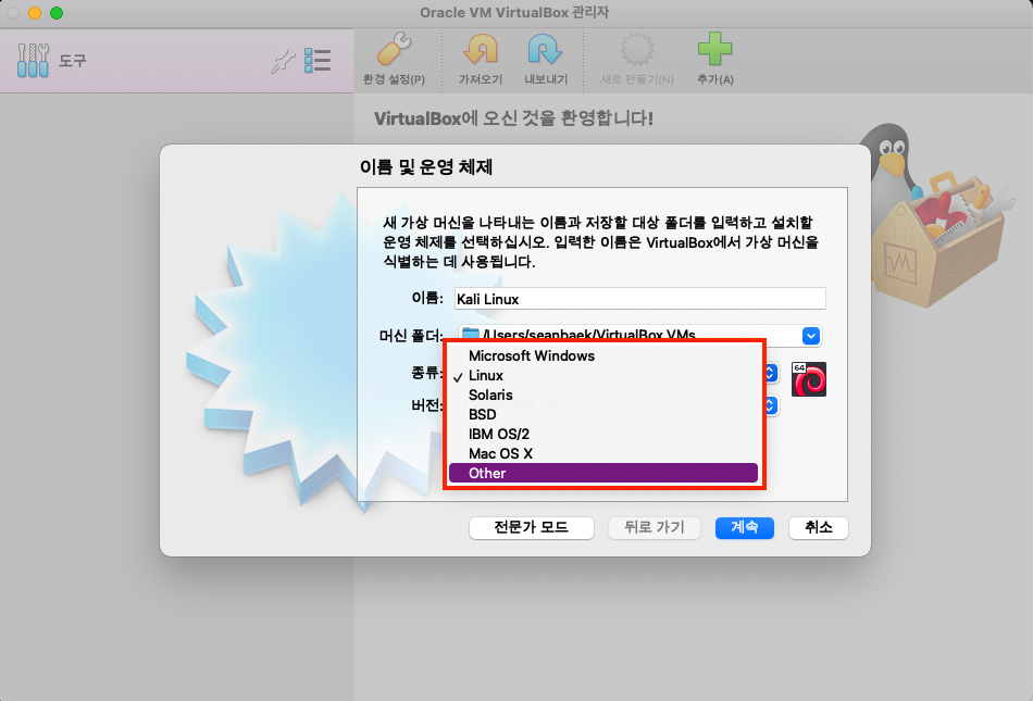 Vbox에는 버전 항목에서 Kali Linux가 없습니다.