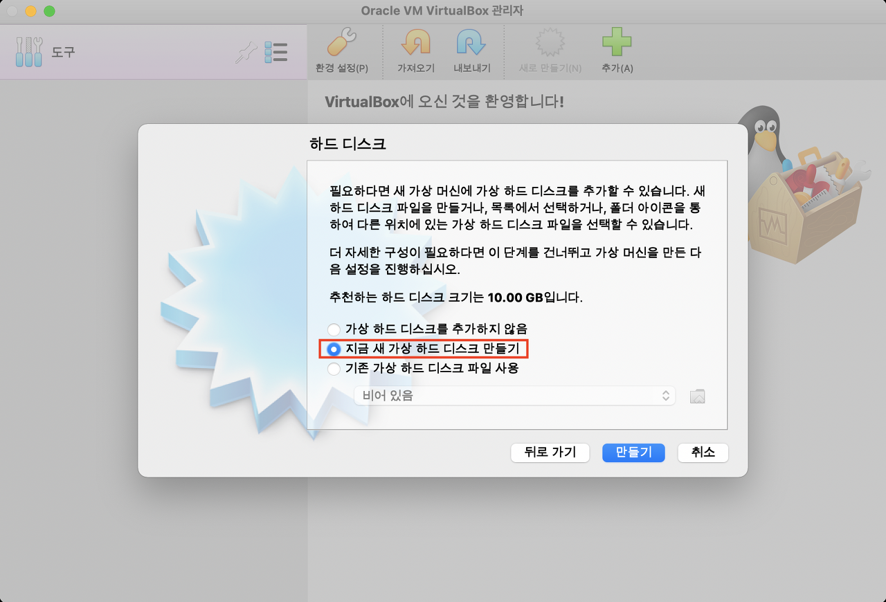 만약 기존에 사용하던 가상 하드 디스크가 있다면 3번째를 선택하면 됩니다.