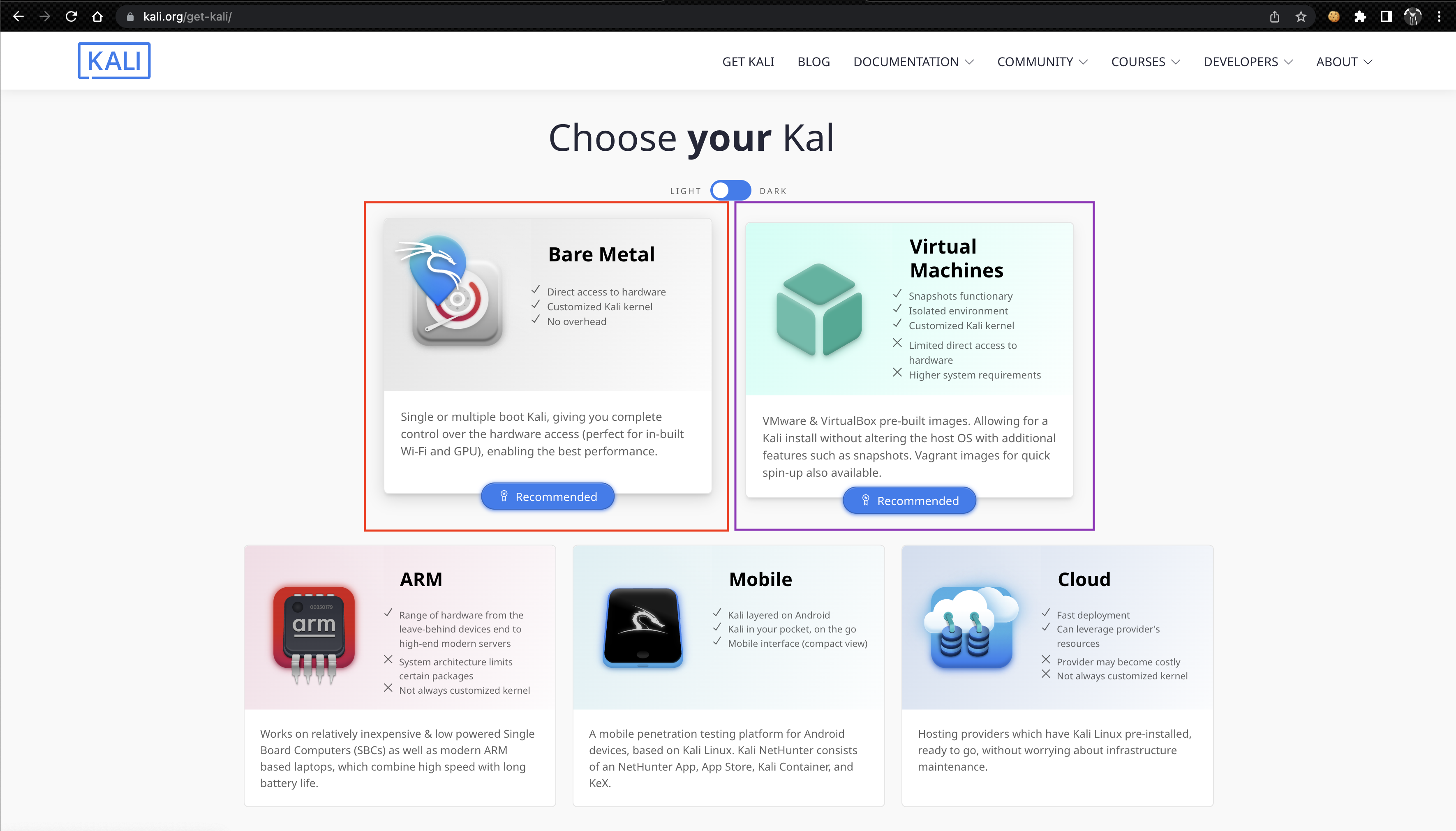 위의 사진에서 빨간 박스 부분의 Recommended를 누르면 Kali linux 기본 ISO 파일을 다운로드하는 것이고