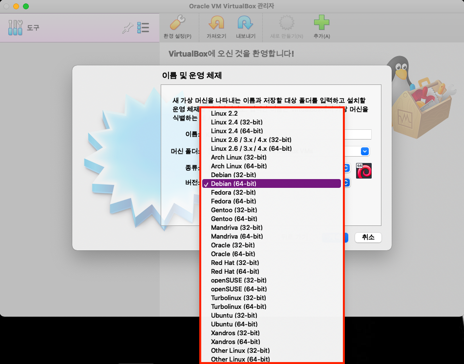 하지만 Kali Linux는 데비안 계열이므로 Debian을 선택하고 다운로드 받은 iso 파일이 32bit인지 64bit인지에 따라 선택하시면 됩니다.