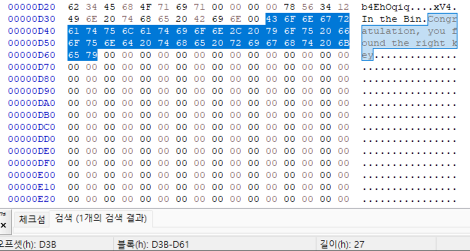문자열 찾기 기능을 이용하면 위와 같이 문자열들이 나오는데, "Congratulation, you found the right key" 문자열을 더블 클릭하여 이동한다.