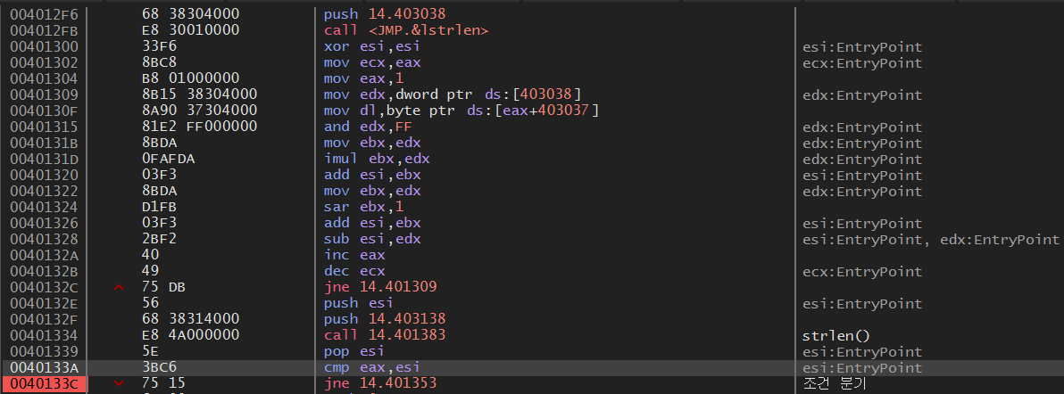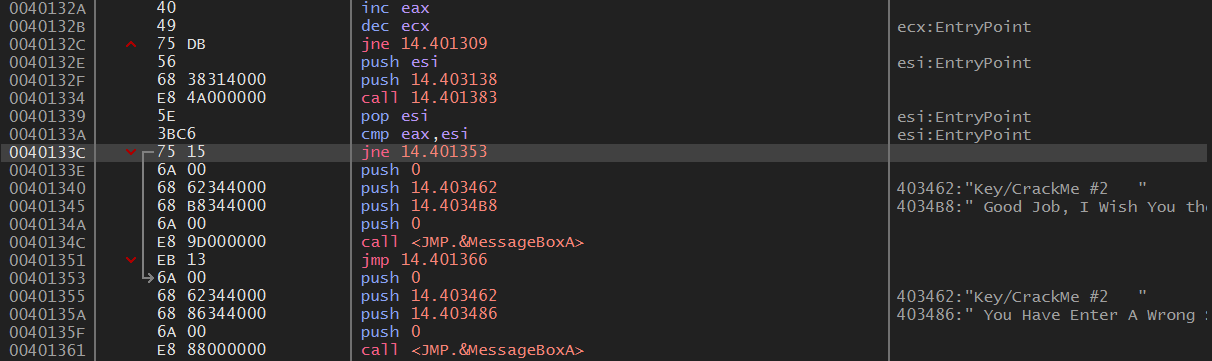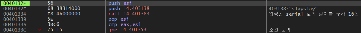 맞는 Serial 값을 입력 했을 때와 맞지 않는 Serial 값을 입력 했을 때의 문자열을 띄우는 조건분기는 40133C 주소에서 jne 명령어이다.