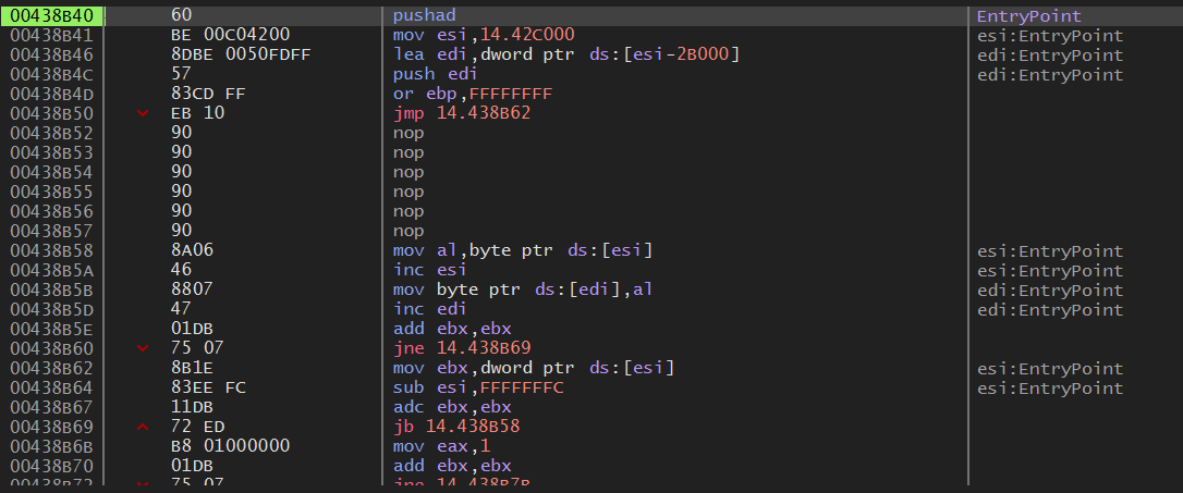 그러면 암호 알고리즘에 의해 Name에 입력된 값이 암호화 된 후 16진수 값으로 esi에 저장된다.