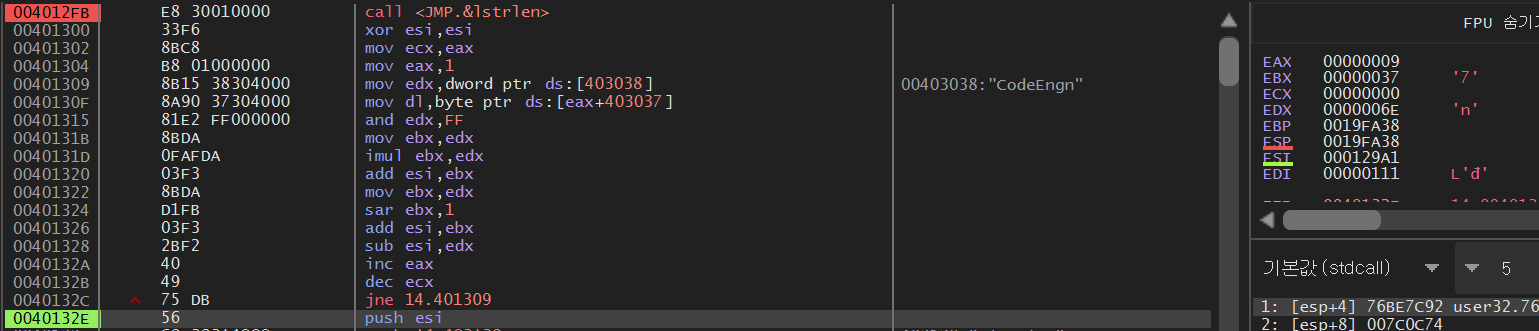2. 403038 주소에는 Name에 입력된 값 "CodeEngn"이 저장되어 있는데 edx에 "CodeEngn" 문자열에서 가져온 문자 하나하나를 담는다.