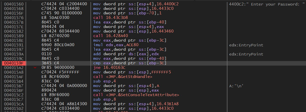 "Good Job" 문자열이 출력되는 부분에서 스크롤을 조금 위로 올리면 40159F 주소에 cmp 명령어가 있다.