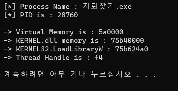 (대상 프로세스가 아닌 현재 프로세스에서 구하는 이유는 Windows에서 kernel32.dll이 프로세스마다 같은 주소에 로딩되기 때문이고, kernel32.dll 같은 파일들을 로드를 안하더라도 로더가 알아서 강제로 로드시키기 때문에 무조건 로드가 되는 dll 파일이다.)