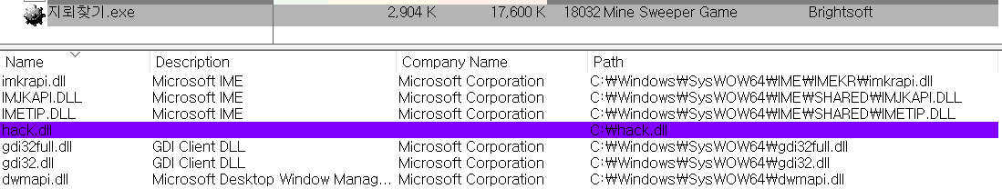 그리고 process explorer에서 지뢰찾기.exe 프로세스에 로드된 DLL 파일 목록을 보면 hack.dll이 로드되어 있다.