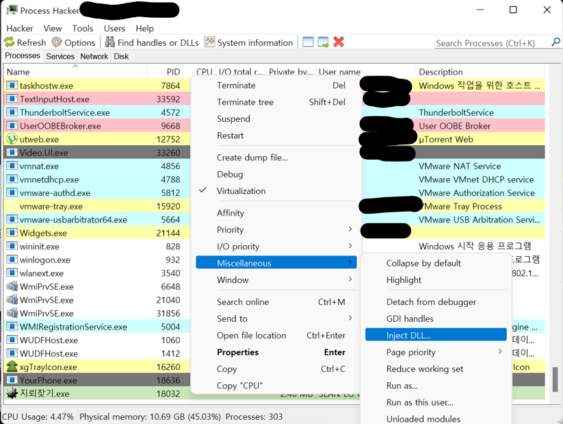 Process Hacker를 이용해 수동으로 프로세스에 DLL Injection하고, Process Explorer에서 확인